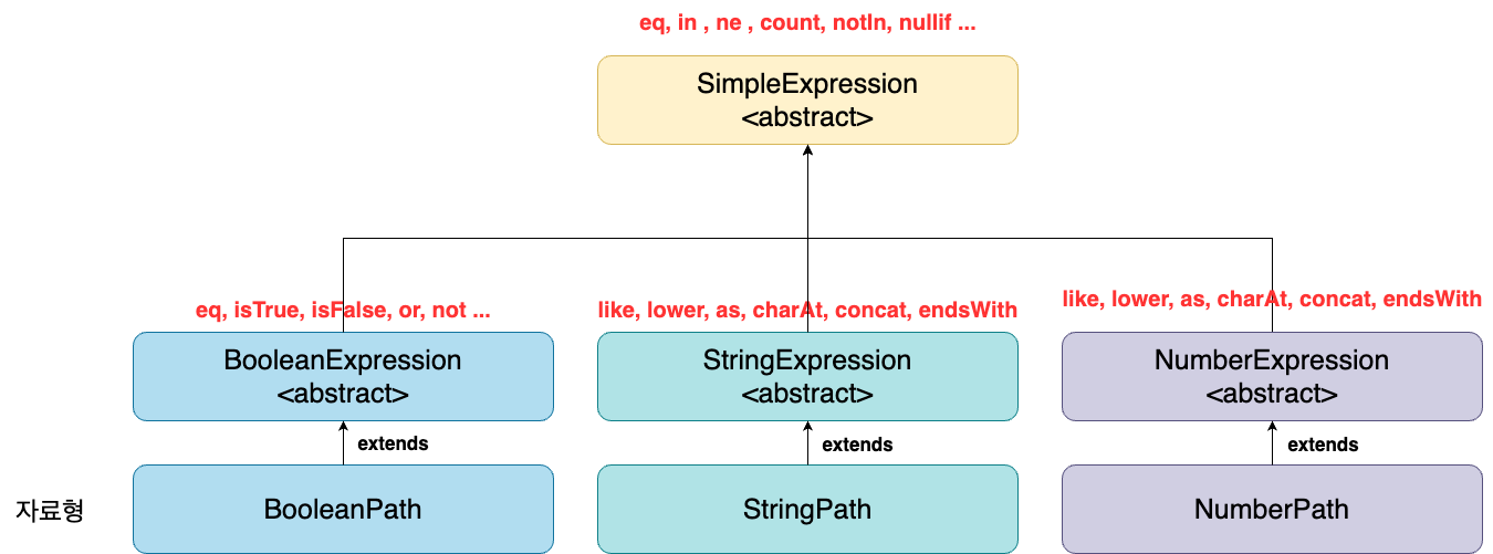 개발자(클라이언트)는 QueryDSL에 위 표현을 요구할 수 있다. 그러므로 Expression은 위와 같이 세분화된 표현도 제공할 수 있어야 한다. 그래서 각 자료형은 타입에 맞는 Expression 추상클래스를 상속한다. Expression 추상클래스는 세분화된 표현을 제공할 수 있는 메소드를 제공한다.