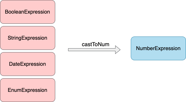 데이터타입은 Boolean, String, Date, Enum이지만 NumberExpression 전용 표현을 사용해야 하는 경우가 있다. 예를들어, DB에 나이(age)가 VARCHAR 타입으로 저장되어 있다면, 이는 StringExpression으로 표현된다. 그러나 나이는 숫자로, 수와 관련된 표현을 해야 하는 경우가 있다. 이런 경우 castToNum으로 캐스팅하여 표현하면 된다.