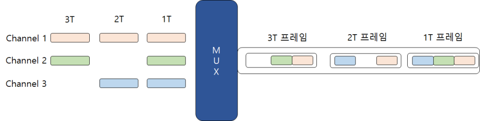 TDM은 디지털 시그널에서 사용되는 멀티플렉싱 방식이다. 시간단위로 나누어, 여러 채널의 시그널의 일부를 모아 하나의 프레임으로 만들기 때문에 디지털 시그널과 같이 1 과 0으로 구분되는 시그널에 적합하다. 시간 단위에 채널에 데이터가 없으면 공간이 낭비된다는 단점이 있다.