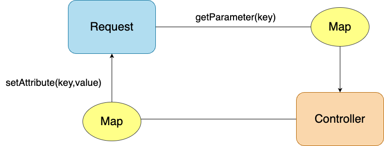 Request와 Controller를 분리하려면, 비즈니스 로직 관련 데이터를 Map 자료구조에 따로 저장하여 Controller에 보내면 된다. 그럼 Controller는 Request가 아닌 Map에 의존하니 오로지 비즈니스 로직으로 응집된 클래스가 된다. Request와 Controller 사이의 작업은 Front-Servlet이 담당한다. 프론트 서블릿은 비즈니스 로직을 제외한 공통작업을 담당한다.