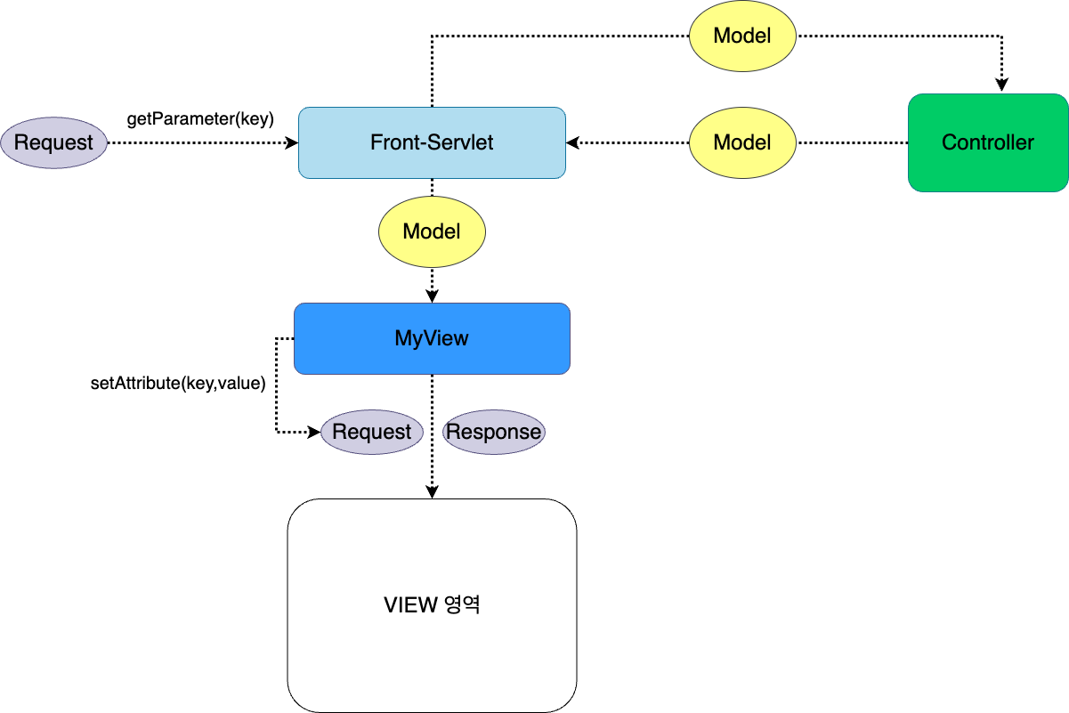 JSP 같은 VIEW 영역에서 Response 객체를 설정하여 클라이언트에게 전달하므로, 서블릿은 응답에 필요한 데이터를 Request 객체에 설정해놓아야 한다. 비즈니스 로직을 처리한 결과를 Model에 담아 MyView 클래스의 render 메소드에 전달하면, model의 데이터를 Request에 설정한다. 그리고 RequestDispatcher를 통해 VIEW 영역으로 응답데이터가 전달된다.