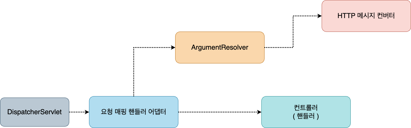 Controller는 필요한 데이터를 파라미터로 요구한다. @RequestBody, @ResponseBody, @ModelAttribute, @RequestParam 같은 어노테이션을 포함하여, HttpEntity 같은 클래스 타입도 요구에 포함된다. HandlerAdapter는 메소드의 파라미터를 읽고 이에 맞는 Request 객체에서 추출하고 변환하여 파라미터로 넘겨준다. 응답 또한 마찬가지이다. 메소드의 반환타입을 읽고 이에 맞는 변환로직을 거친다.
