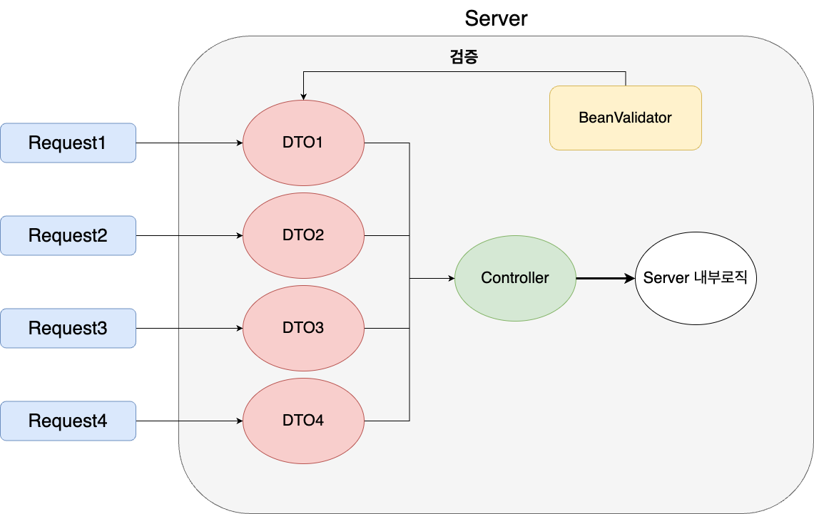 요청이 들어오면 요청에 맞는 DTO 객체에 요청데이터가 담긴다. DTO 필드에는 @NotNull, @NotEmpty 같은 어노테이션이 선언되어 있는데, BeanValidator는 선언되어 있는 어노테이션을 토대로 필드에 담긴 데이터를 검증한다. 그리고 검증결과를 Controller에 넘긴다. Controller는 검증결과에 따라 클라이언트에 적절히 응답하면 된다. 실무에서는 주로 이런 방식으로 요청데이터를 검증한다.
