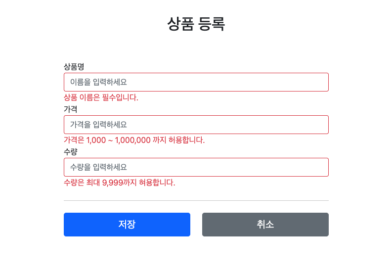 아무런 데이터도 넣지 않고 저장 버튼을 클릭해보았다. Model에 담긴 오류 데이터는 Thymeleaf로 전달되고 Thymeleaf는 화면에 오류 데이터를 동적으로 생성하여 HTML을 만든다. HTML은 클라이언트에 전달되어 위 사진처럼 화면에 그려진다.