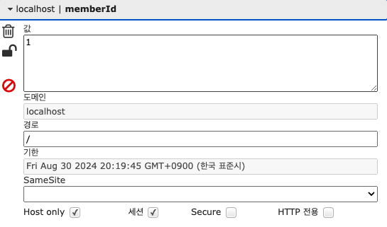위 코드대로 생성한 쿠키정보이다. 쿠키명은 "memberId"이고 쿠키데이터는 1이다. 1은 누구나 쉽게 예측할 수 있다. 1이 있다면 2가 있고 2가 있다면 3이 있다. 1을 3으로 바꾸고 서버로 전송하면 3을 쿠키로 가지는 회원정보에 접근할 수 있게 된다.