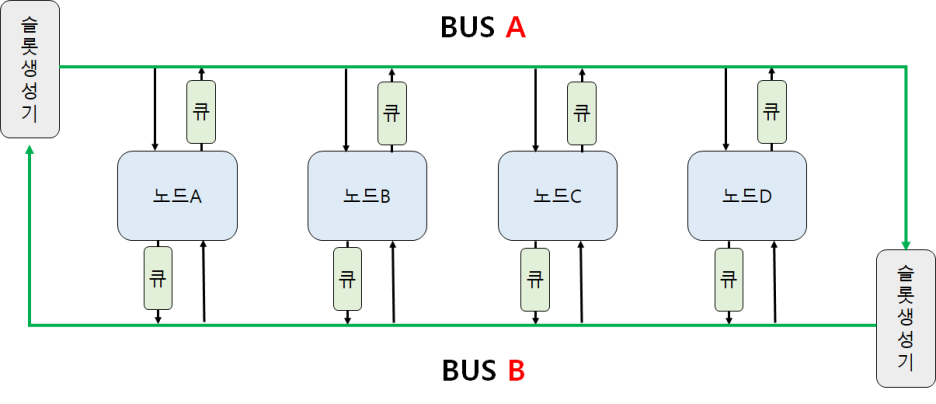 DQDB방식은 '예약'방식을 통해 슬롯을 차지한다. BUS A로 데이터를 보내고 싶으면 좌측에 있는 슬롯생성기에게 슬롯을 예약해야한다. 그러나 BUS A는 우측으로 데이터를 전송하니 BUS B를 통행 슬롯 예약을 한다. 이렇듯 예약은 보내고 싶은 BUS의 반대 BUS를 통해 이루어진다.
