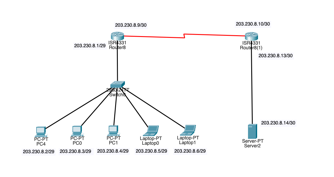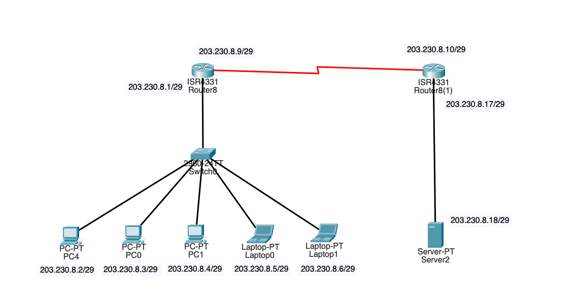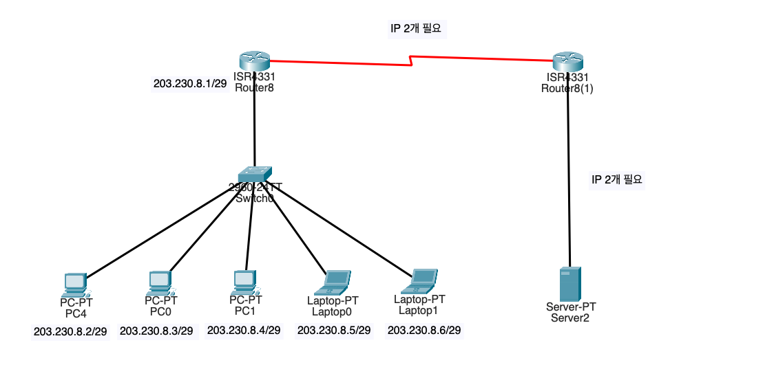 네트워크 2개가 추가되었다. 하나는 라우터 간의 네트워크이고 다른 하나는 서버장비가 있는 네트워크이다. 그럼 서브넷 마스크를 29로 하여 IP를 부여해보자.