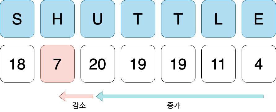 우리가 원하는 단어는 SHUTTLE의 '바로 다음' 단어이다. L이 새롭게 H자리에 왔을때 사전 순으로 가장 첫 단어는 남은 알파벳이 오름차순으로 정렬되었을 때이다.