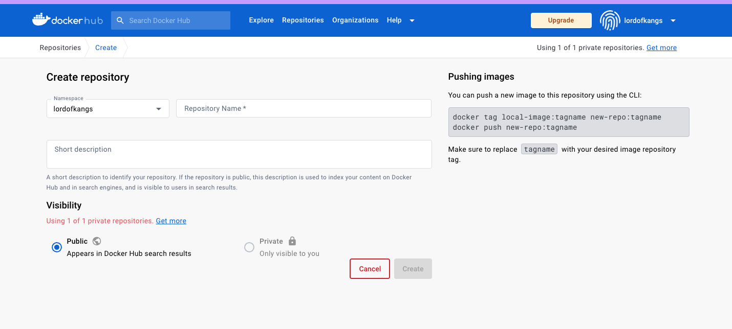 이미지는 도커허브의 리포지토리에 등록된다. 리포지토리 이름은 도커 이미지와 일치하도록 설정한다. 도커 이미지는 이름과 일치하는 도커 리포지토리로 등록된다.