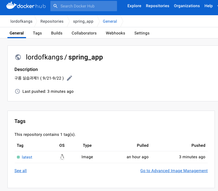 Tags란에 이미지가 등록된 것을 확인할 수 있다. 그럼 이제는 Dockerfile이 없어도 도커허브에 등록된 이미지를 pull 하여 컨테이너를 띄울 수 있게 되었다.