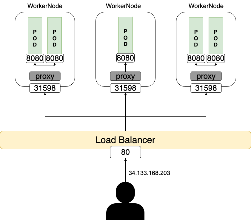 로드밸런서는 균형있게 요청(Request)을 워커노드에 분산한다. 워커노드 안에는 파드가 여러 개 있기에 프록시가 동작하여 적절한 컨테이너에 요청을 전달한다.