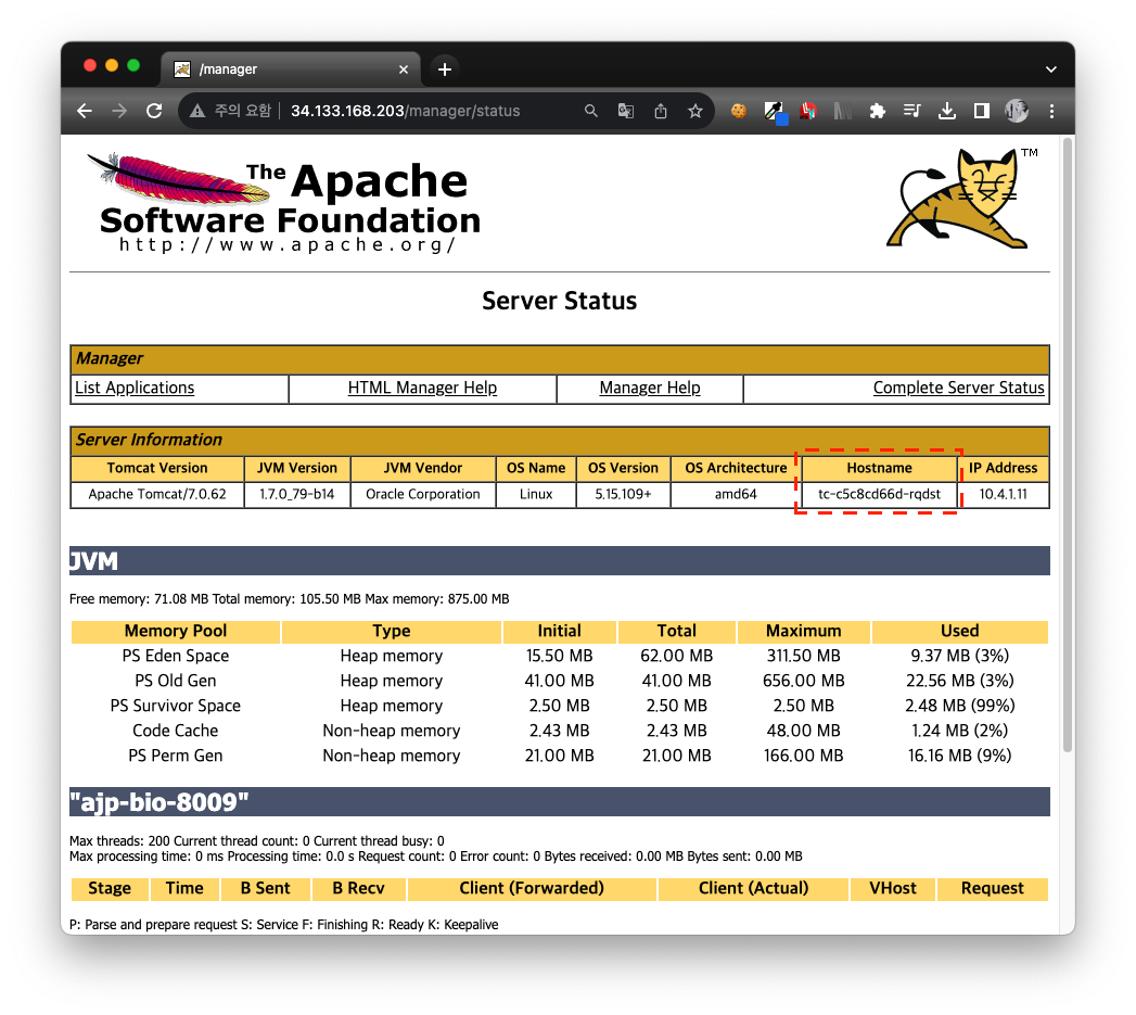 브라우저에 로드밸런서 IP와 80포트를 주소로 입력하니 톰캣 페이지가 열렸다.