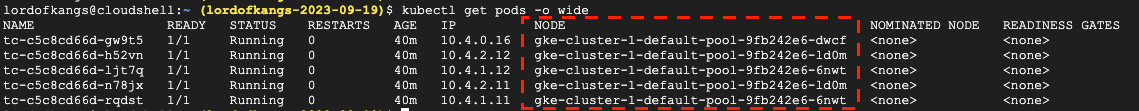 마스터 노드는 이미지를 도커허브에서 가져와 빌드하여 컨테이너를 생성할 수 있도록 도커 설정이 되어있다. GKE가 자동으로 설정하므로 우리가 따로 도커 설정을 할 필요는 없다. --replicas 옵션에 생성할 컨테이너 수를 설정하면 컨테이너가 생성되어 3개의 워커노드에 배포된다.