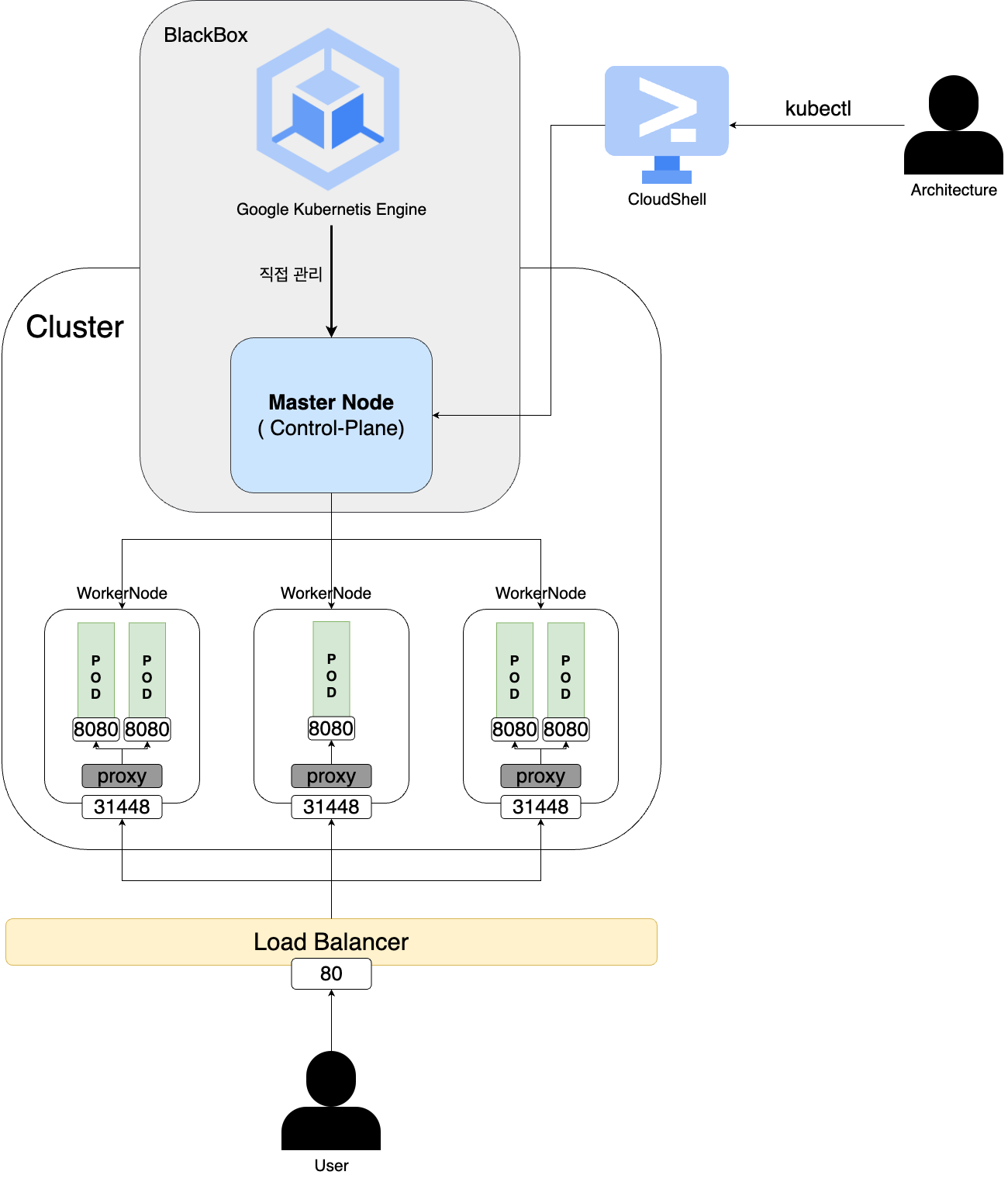 아키텍처는 마스터노드에 접속할 수 없고 클라우드쉘로만 대화가 가능하다. GKE가 마스터노드를 직접 관리하므로써 도커설정이나 네트워크 설정, 보안 설정 등이 자동화되었다. 아키텍처는 그저 웹페이지에서 원하는 스펙을 선택하여 클러스터를 생성하면 된다.