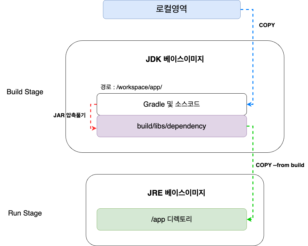 RUN으로 gradle를 동작시켜 .class 파일 압축파일인 jar를 생성한다. ( RUN ./gradlew bootJar ) 그리고 jar 파일을 jar -xf 명령으로 build/libs/dependency 폴더에 압축을 해제한다. 그럼 dependency 폴더에는 실행이 가능한 class파일들이 모인다.