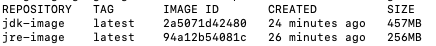 JDK로 이미지를 만들었을때는 457MB였는데 Multi Stage로 JRE를 베이스 이미지로 만들면 256MB로 사이즈가 뚝 떨어진다. 그럼 해당 이미지로 실제 컨테이너를 구동해보자.
