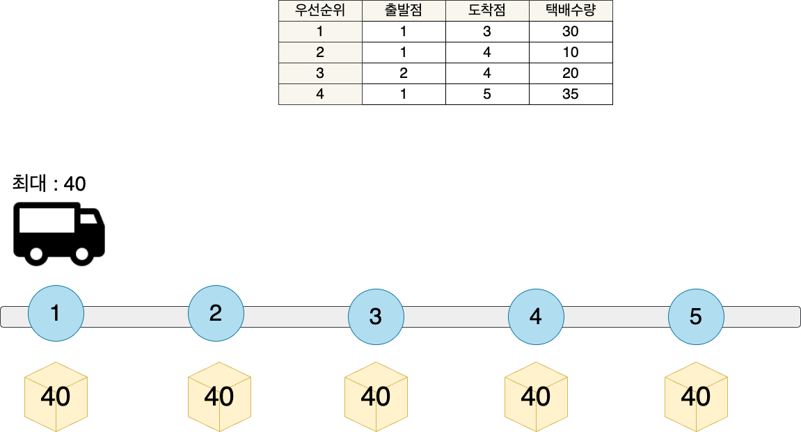 처음에는 시작점을 오름차순하고 그 다음 도착점을 오름차순하여 택배를 트럭에 싣는 방식을 생각했다. 그러나 문제가 있었다. 지점이 1 부터 5까지 있다고 해보자. 1을 시작으로 하고 5를 도착으로 하는 택배는 1부터 5까지 트럭이 이동하는 동안 공간을 차지하고 있게 된다. 이는 최적의 상황이라고 할 수 없다.