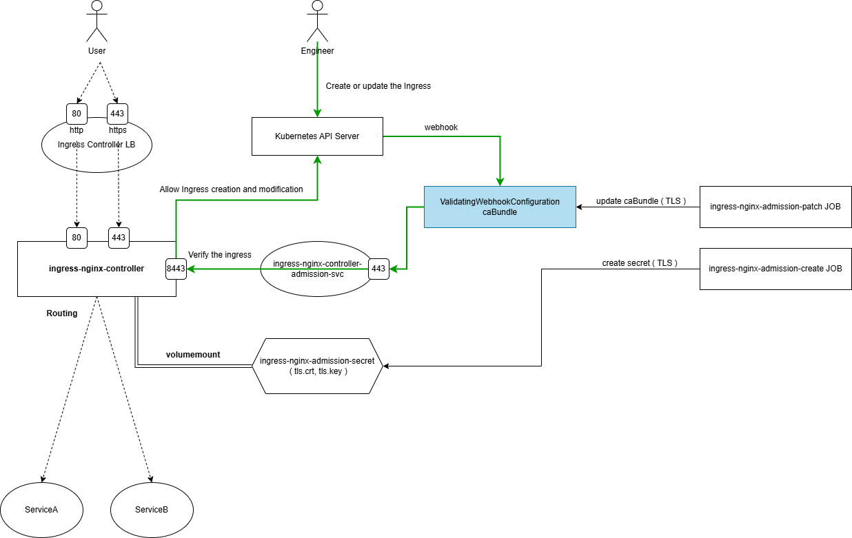 API 서버는 webhook으로 ingress가 적합한 포맷인지 검증하라는 요청을 ingress controller로 보낸다.