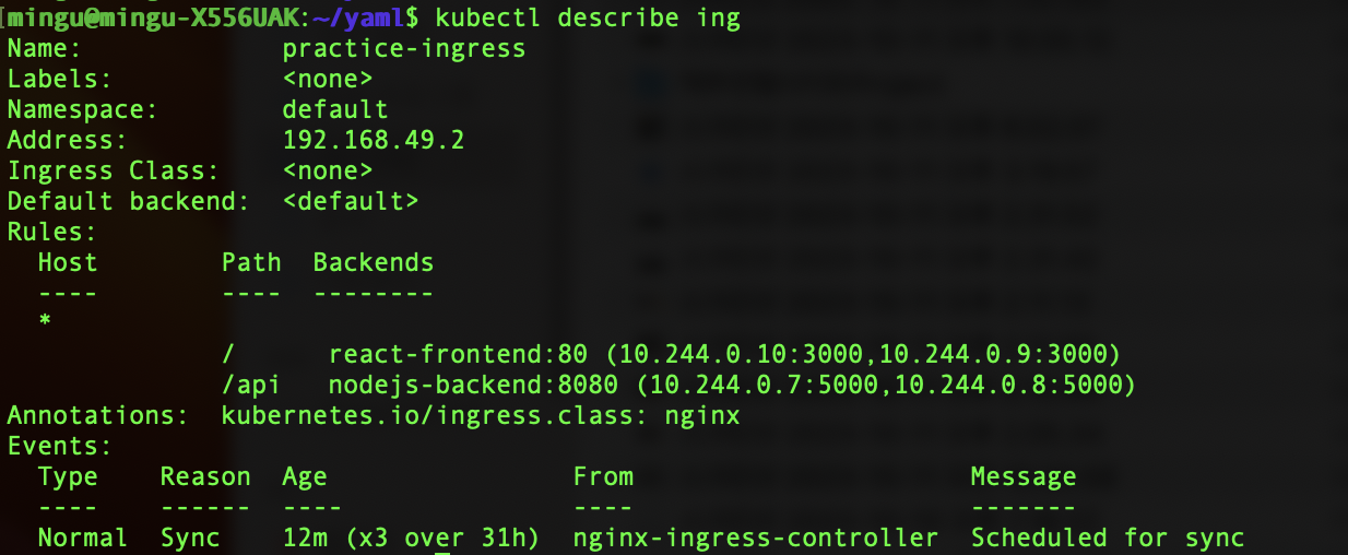 적용이 완료되면 kubectl describe 명령어로 ingress가 잘 설정되어 있는지 확인한다.
