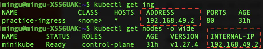 ingress 정보를 보면 주소가 192.168.49.2로 설정되어 있다. 이는 마스터 노드(컨트롤-플레인)의 ip와 일치한다. minikube는 노드가 하나 존재하는데, 그것이 마스터 노드이다. 마스터노드의 ip가 곧 인그레스의 ip이다.