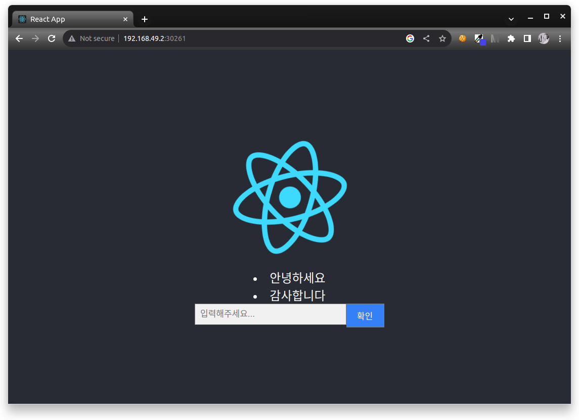 192.168.49.2:30261로 접근하면 Minikube노드(192.168.49.2)는 30261 포트로 들어온 트래픽을 인그레스 컨트롤러 서비스로 포워딩한다. 인그레스 컨트롤러 서비스는 인그레스 컨트롤러 파드로 포워딩하고 인그레스 컨트롤러는 '/' 경로로 들어온 요청은 리액트 프론트엔드 서비스로 포워딩한다. 프론트엔드 서비스는 프론트엔드 파드로 포워딩하고 프론트엔드는 리액트 화면을 클라이언트에 응답한다.