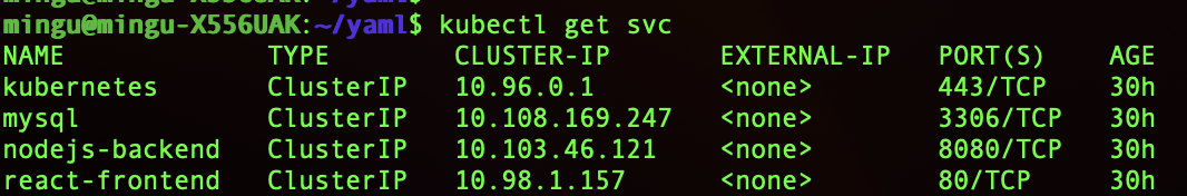 서비스는 클러스터 내부에서만 사용하는 Private한 IP를 부여받는다. 해당 IP에는 클러스터 내부에서만 접근이 가능하다. 서비스는 클러스터 내부에서 들어오는 트래픽을 받을 수 있도록 포트를 열어놓는다. 위 사진을 보면, mysql 서비스는 3306포트, nodejs 서비스는 8080포트, react 서비스는 80포트가 열려있다. 이와 같이, 클러스터 내부 트래픽만 접근이 가능하도록 포트를 열어놓는 서비스를 ClusterIP 서비스라고 부른다.