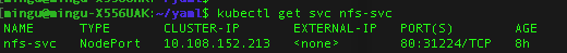 Nginx 서비스의 80포트와 Nginx 컨테이터 80포트와 포트포원딩하였다. 그리고 외부에서 접근이 가능하도록 노드포트 타입으로 서비스를 생성하여 서비스의 80포트와 노드포트를 포트포워딩하였다. 그리고 Nginx 디플로이먼트로 파드를 생성한다. volumeMounts에 /usr/share/nginx/html 경로를 설정하여 해당 경로와 PV를 마운트한다. PV와 마운트하기 위해 volumes 설정에 nfs-pvc를 설정한다.