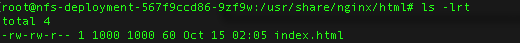 실제 파드 안으로 들어가 /usr/share/nginx/html로 접근하면 index.html을 발견할 수 있다. 이처럼 클러스터 외부에 독립적으로 존재하는 스토리지에 마운트하여 클러스터 내부의 데이터 유지 및 공유가 가능하다.