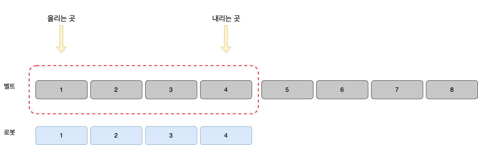 벨트 자료구조를 우측으로 값을 복사하였다. 벨트 위에 있는 로봇도 함께 우측으로 이동한다.
