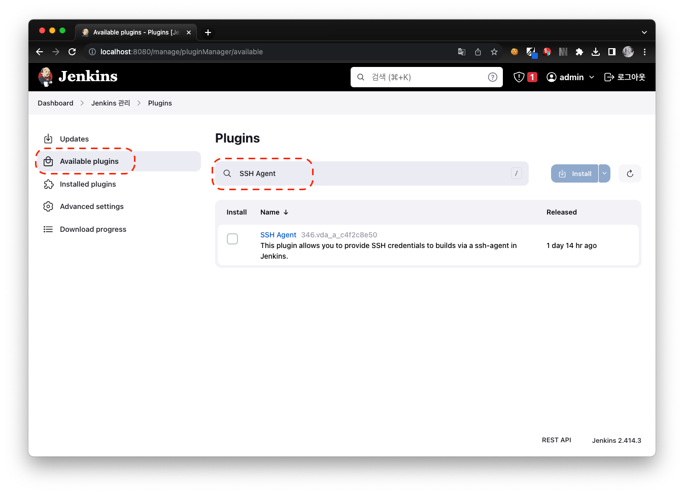 SSH Agent는 SSH 원격접속 과정에서 필요한 Credential를 Jenkins 빌드 과정에 제공하는 플러그인이다. 자세한 사용법은 뒤에서 다루어보겠다. 우선 설치를 해보자.