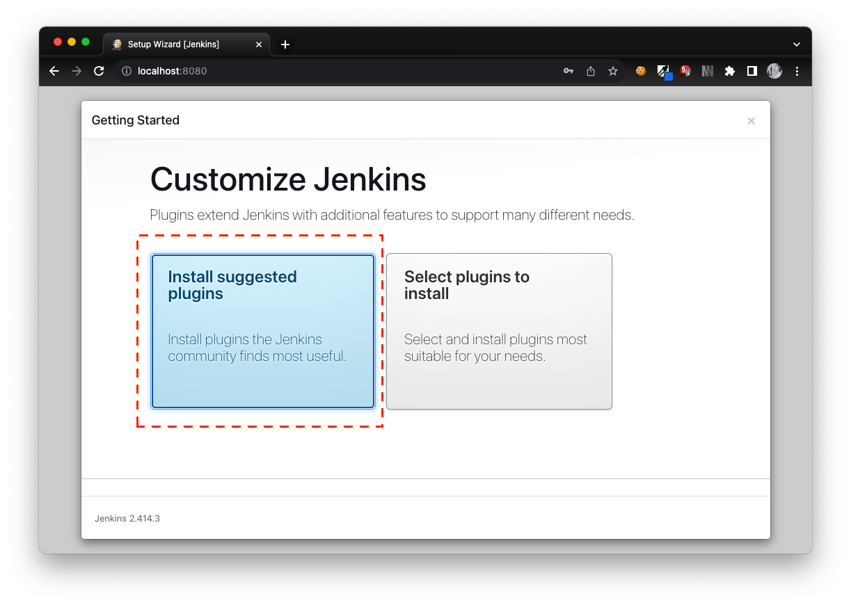 docker exec 명령어로 컨테이너에 접속해서 initAdminPassword 파일을 열어보면 초기패스워드를 알 수 있다. 패스워드를 입력하면 플러그인 설치 화면으로 넘어간다.