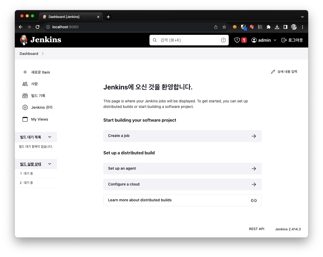 플러그인을 설치하고 Admin 계정을 생성하면 Jenkins를 사용할 수 있다.
