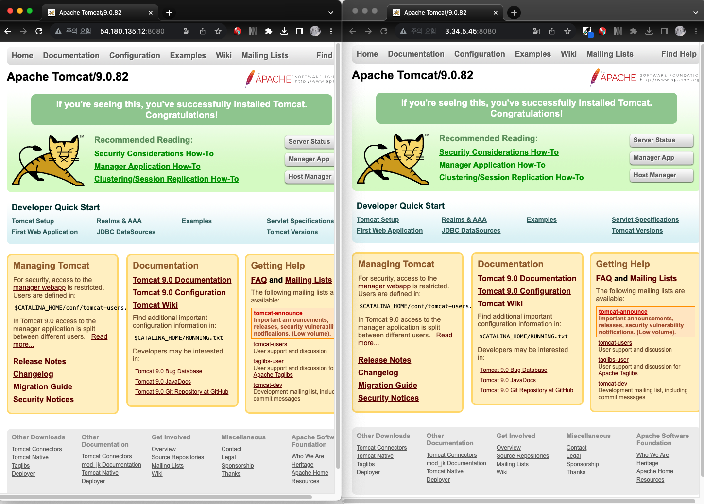 톰캣서버는 8080 포트를 오픈한다. EC2 인스턴스도 8080 포트를 인바운드 규칙으로 오픈하면 EC2의 Public IP로 톰캣서버에 접속이 가능하다.