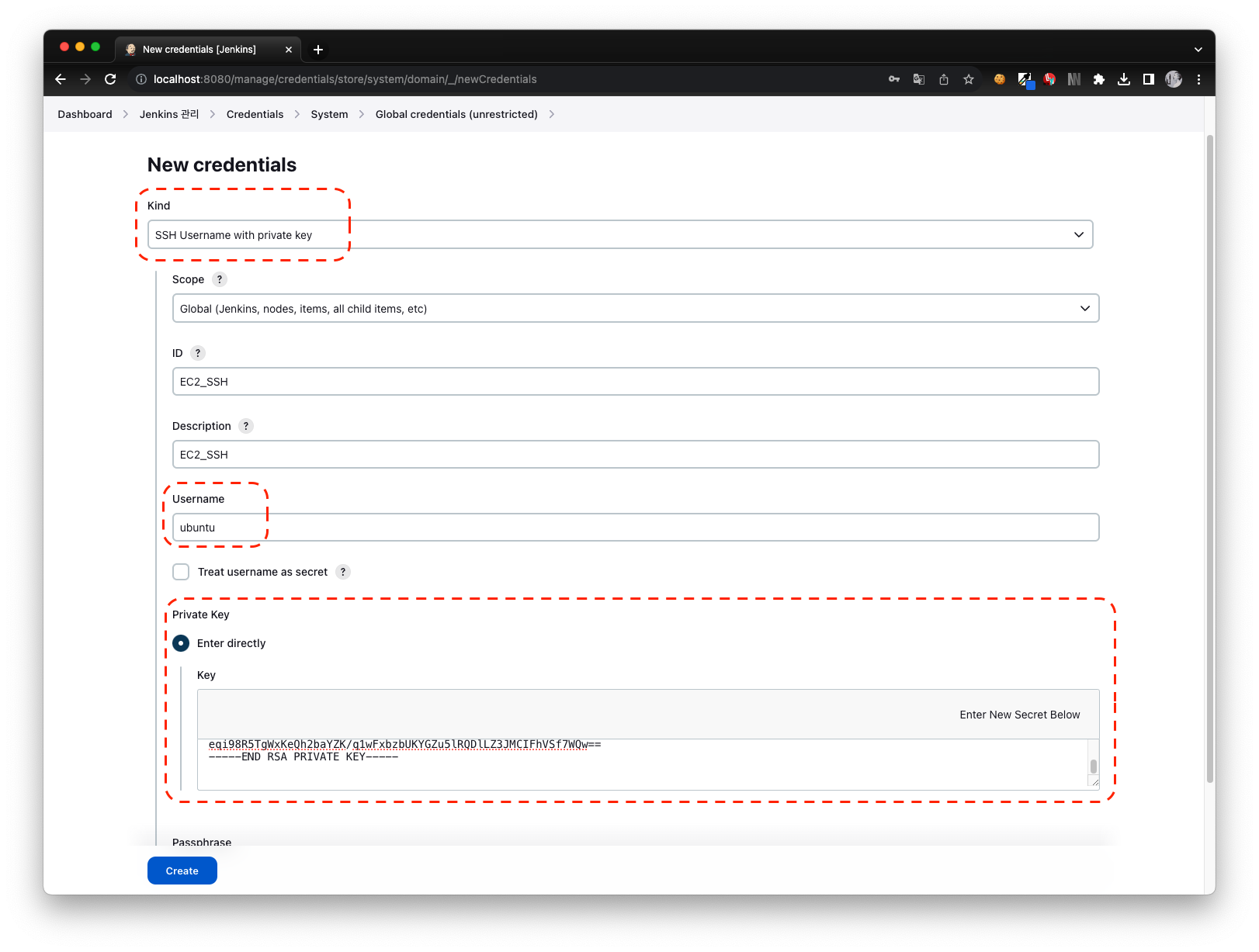 ID는 Credential 이름을, Username에는 EC2 인스턴스에 SSH 원격접속할 User 계정을, Private Key는 Enter directly를 눌러 PEM 파일에 저장된 key데이터를 입력한다.