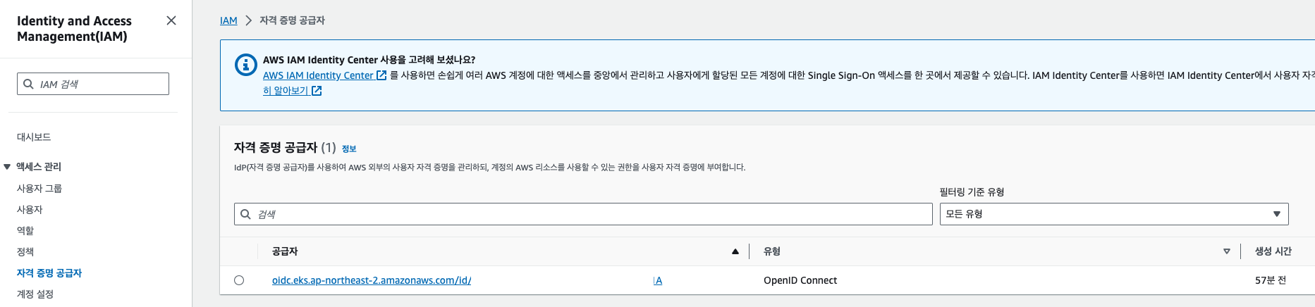 AWS 콘솔로 가면 위 사진처럼 자격 증명 공급자가 생성되었음을 확인할 수 있다.