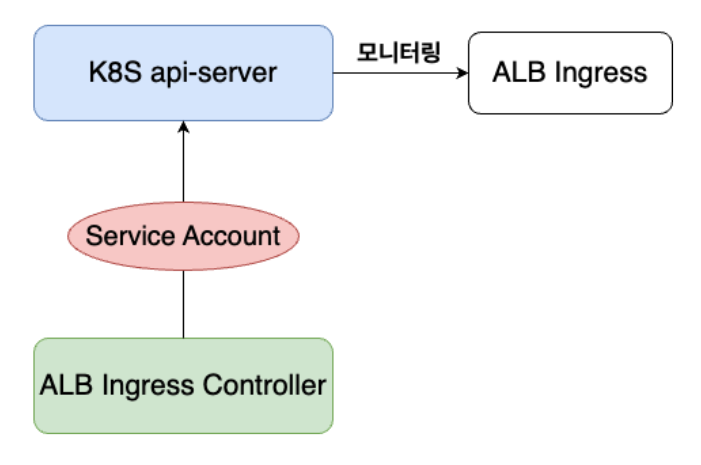 그럼 AWSLoadBalancerControllerIAMPolicy 정책을 가지고 있는 IAM이 OIDC ID를 토대로 EKS 안에 ServiceAccount를 생성한다. ServiceAccount는 k8s api-server가 인증하는 OIDC ID를 소유하고 있고 인가 가능한 정책을 수행할 수 있는 Role을 부여 받는다. 그러므로 해당 Service Account로 설정되어 생성된 Ingress Controller는 k8s api-server에 접근하여 Ingress 리소스를 생성 및 모니터링 할 수 있게 된다.
