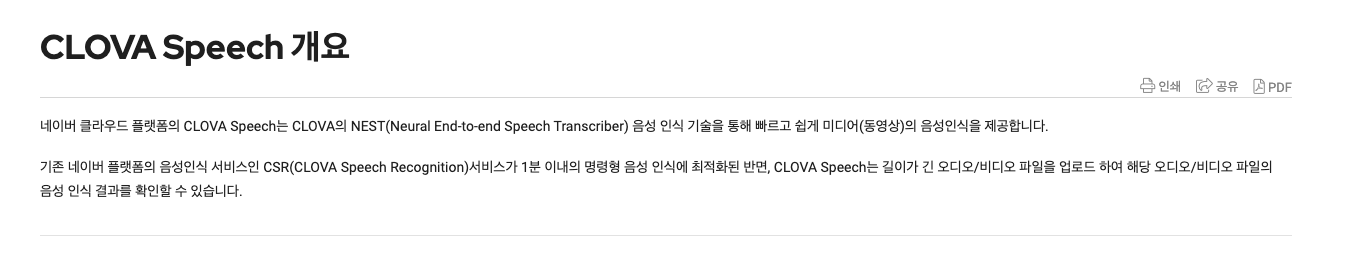 CLOVA 문서 정리가 잘 안 되어 있는 것 같다. 음성파일 1분 이하만 텍스트 변환이 가능하다는 것을 Clova Speech 문서 보고 알았다... Summary 문제에 대한 공식 답변도 안 달리는 것보니 CSR이랑 Summary는 내다버린 서비스인가 싶다...