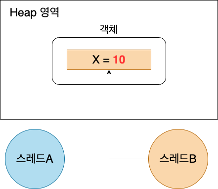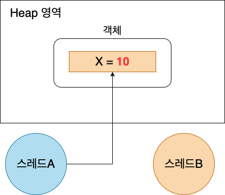스레드B도 객체의 멤버변수에 접근하여 데이터를 10으로 변경하였다. 이후 CPU가 다시 대기하던 스레드A에게 컨텍스트스위칭 되었고 스레드A는 이전에 못했던 멤버변수X를 인출하려고 한다.