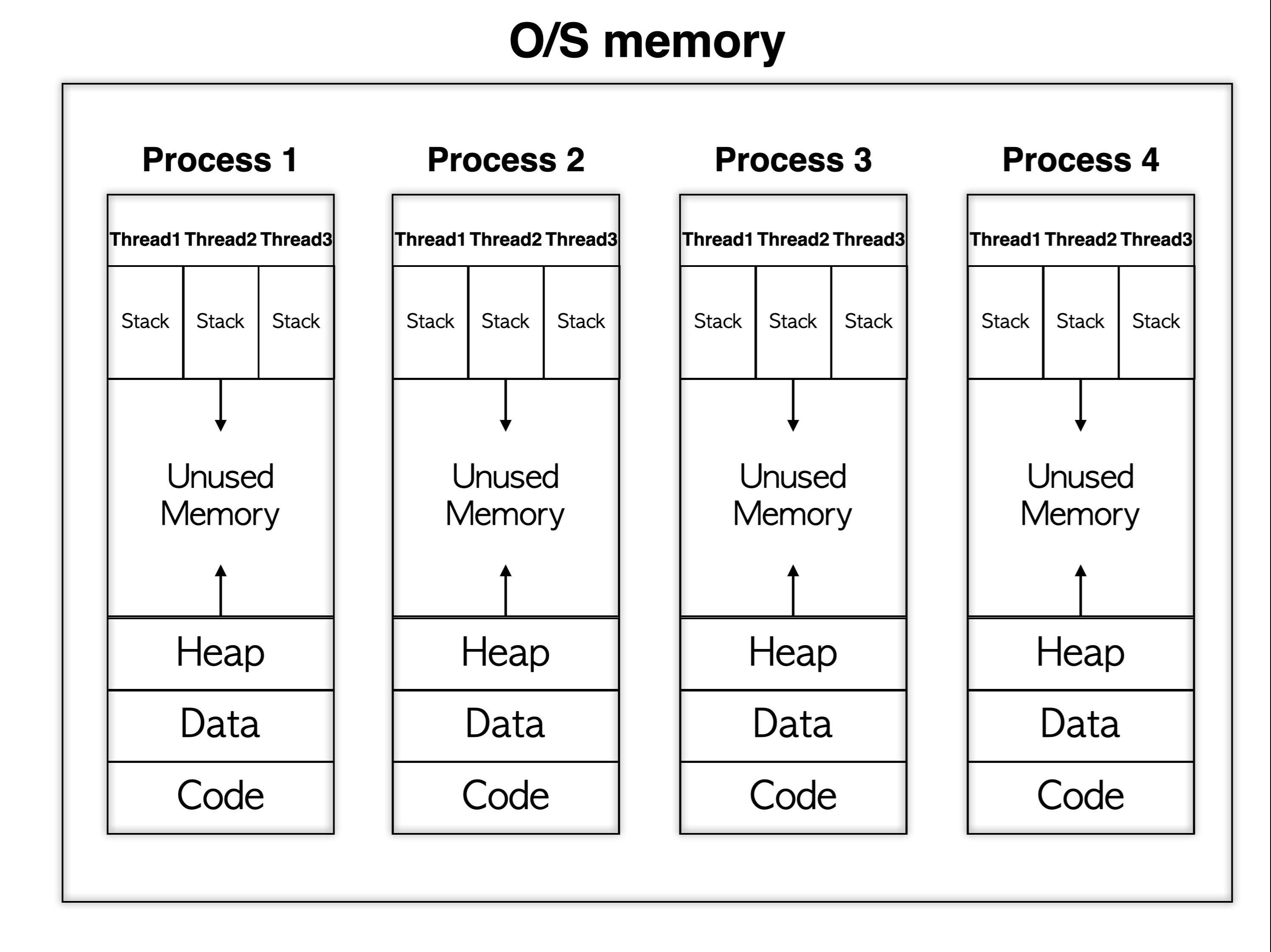 어떠한 처리 흐름을 만들려면 독립적인 메모리 공간이 필요하다. OS가 프로세스에게 메모리를 할당하면 프로그램은 할당받은 메모리 공간을 나누어 스레드에게 할당한다.