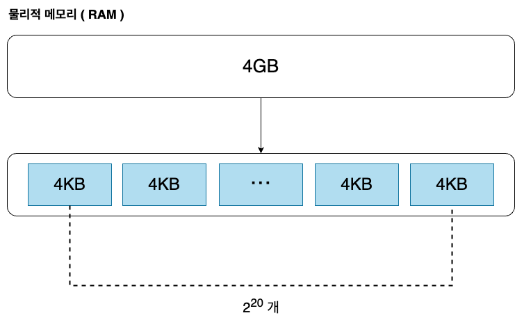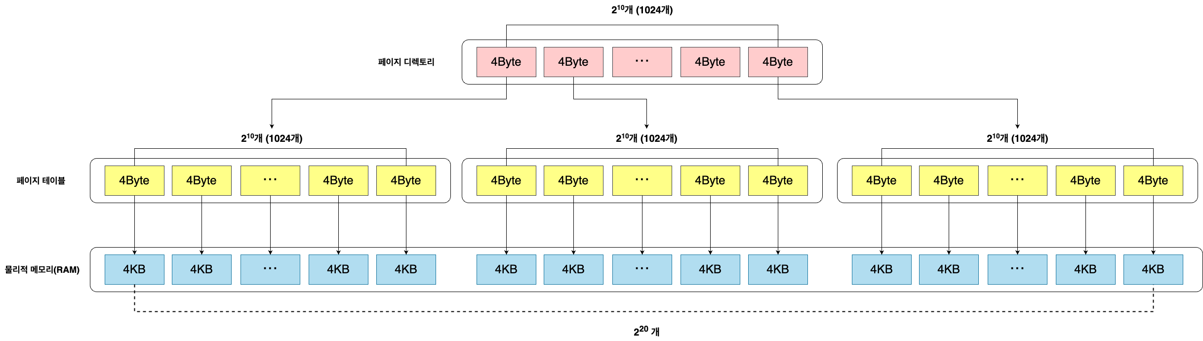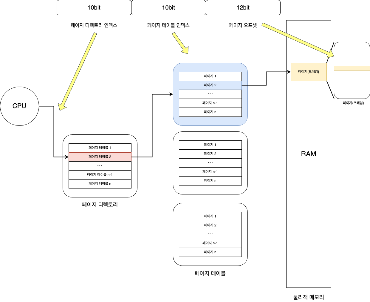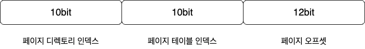 32bit 중 10bit는 페이지 디렉토리 인덱스에 할당하고 10bit는 페이지 테이블 인덱스에 할당하고 나머지 12bit는 212 경우를 나타내므로 4KB(212) 페이지 내부주소(오프셋)로 사용한다.