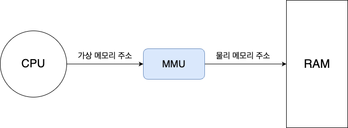 가상메모리 기법이란 CPU가 가상주소로 메모리에 접근을 시도하면 MMU(Memory Management Unit)가 가상주소를 물리주소로 변환하여 실제 RAM으로 매핑해주는 기법을 의미한다.