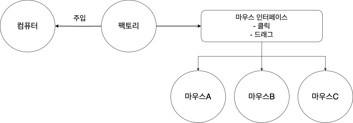 Mouse mouse = new MouseA(); // MouseA 구현체에 의존, 결합도 증가