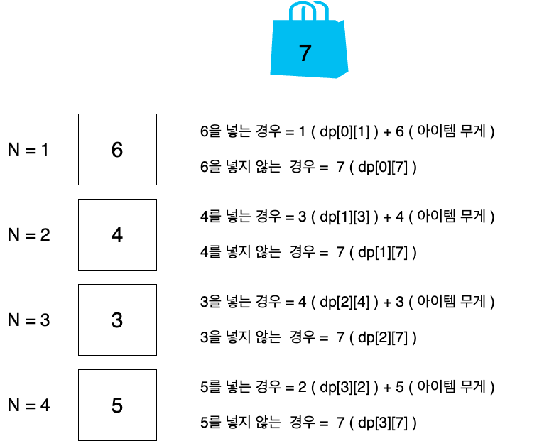 아이템1에서 아이템4까지 넣는 경우와 넣지 않은 경우를 처리하며 dp에 메모리제이션을 한다. 4번째 아이템에 왔을 때는, 4가지 아이템의 경우를 모두 고려한 dp 계산이 가능해진다.