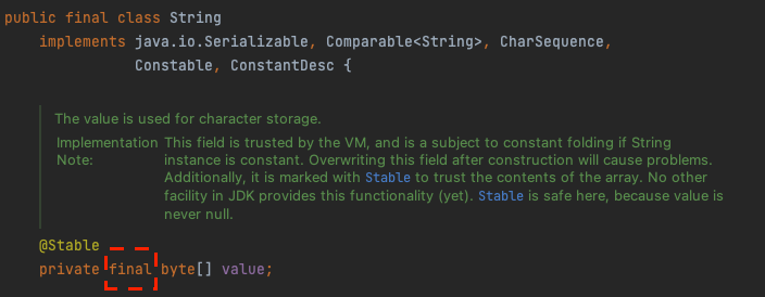 바이트 배열에 문자열 데이터가 저장되는데, final 키워드로 선언되어 있어 한번 초기화되면 변경이 불가능해진다. 이로써 한번 생성된 문자열 객체는 다른 스레드에 의해 변경되지 않으니, Thread Safe하다고 할 수 있다.