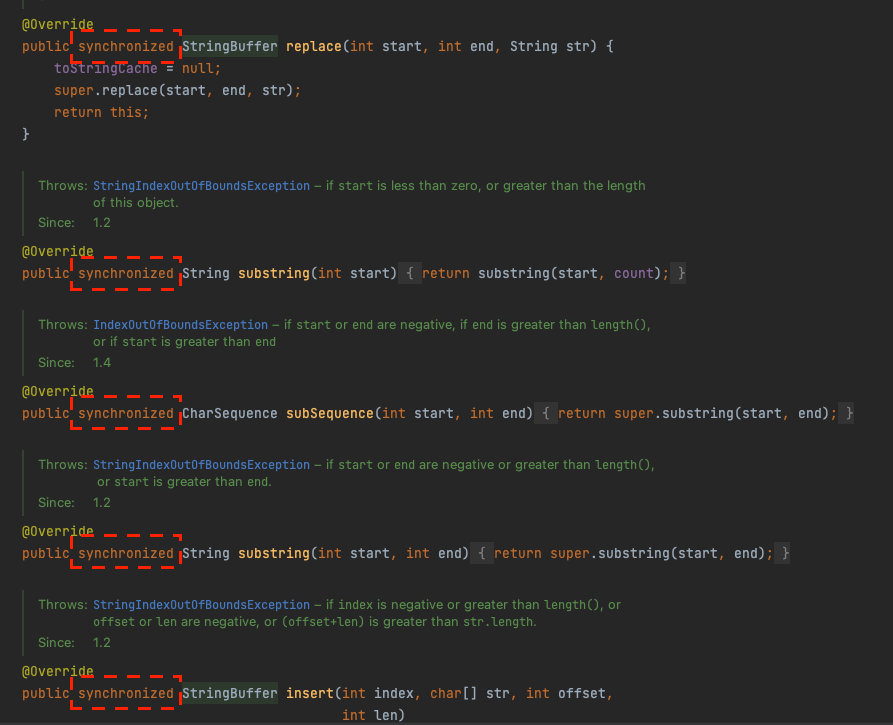앞서 말했듯, String이 불변객체이어야 하는 이유는 멀티스레드 환경에서 문자열 데이터의 정합성을 보장하기 위함이다. 그러므로 가변객체로 풀어주는 대신, 정합성을 보장할 무언가가 필요하다. 그것이 바로 sychronized 키워드이다.