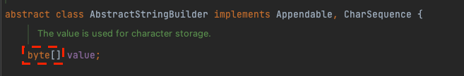 AbstractStringBuilder는 문자열이 저장되는 바이트 배열에 final 키워드가 없다. 즉, 가변객체라는 의미이다.