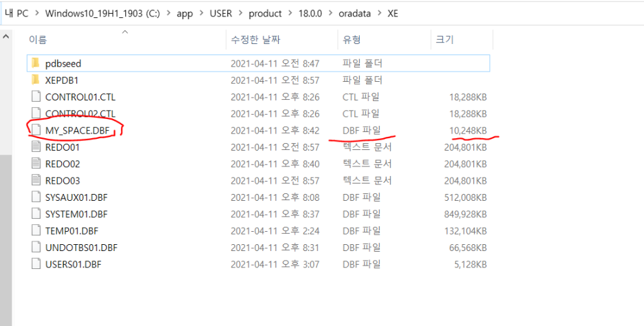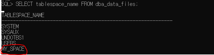 이렇게 데이터 파일이 생성되었음을 알 수 있다. 앞으로 my_space 테이블스페이스에서 만들어지는 테이블들은 이제 MY_SPACE.DBF 파일에 저장되어 DISK에 저장될 것이다.