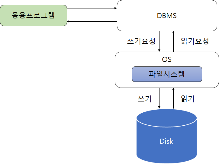 DBMS가 Disk와 대화하며 데이터의 입출력을 담당할 것 같지만 사실 그렇지 않다. 데이터의 입출력이 실제로 이루어지는 곳은 OS의 파일시스템이다. '파일'단위로 Disk로부터 입출력이 발생하므로 파일시스템이라 부른다.