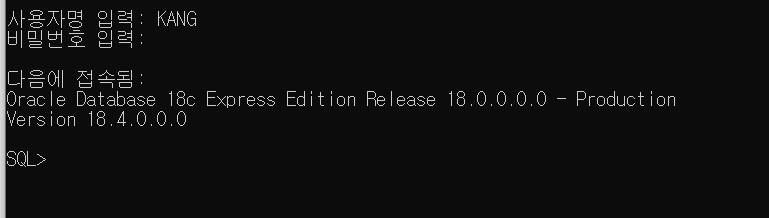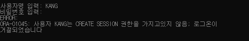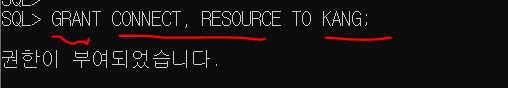 권한을 부여하는 명령어는 GRANT이다. KANG계정에 권한부여를 완료했다. 다시 해당 계정으로 접속해보자.