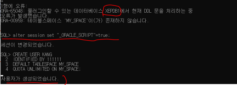 처음에 계정생성 할 때, 오류가 났다. XEPDB 이야기를 하는 것 보니, PDB와 관련된 문제인거 같은데, 아직 내 수준에서는 정확한 문제 원인은 잘 모르겠다.